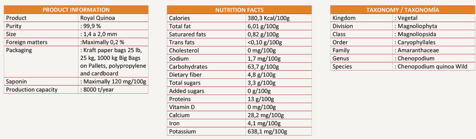 Royal Quinoa är naturligt glutenfri och uppvisar, i jämförelse med konventionella spannmål, högre halter av protein, fett, fiber och aska, vilket gör den till ett mycket konkurrenskraftigt och hälsofrämjande livsmedel av stor betydelse i människans kost. Dess näringsvärde beror till stor del på det höga proteininnehållet, varav cirka 37 % består av essentiella aminosyror, särskilt lysin, metionin, treonin och tryptofan. Därutöver innehåller Royal Quinoa viktiga mineraler såsom kalcium, järn, fosfor och zink. Den är även rik på B-komplexvitaminer samt vitaminerna C och E, med högre halter av vitaminerna B och C än vete. Vidare innehåller den betydande mängder karoten och niacin (vitamin B3), samt avsevärt högre nivåer av riboflavin (vitamin B2), tokoferol (vitamin E) och karoten jämfört med vete och ris.